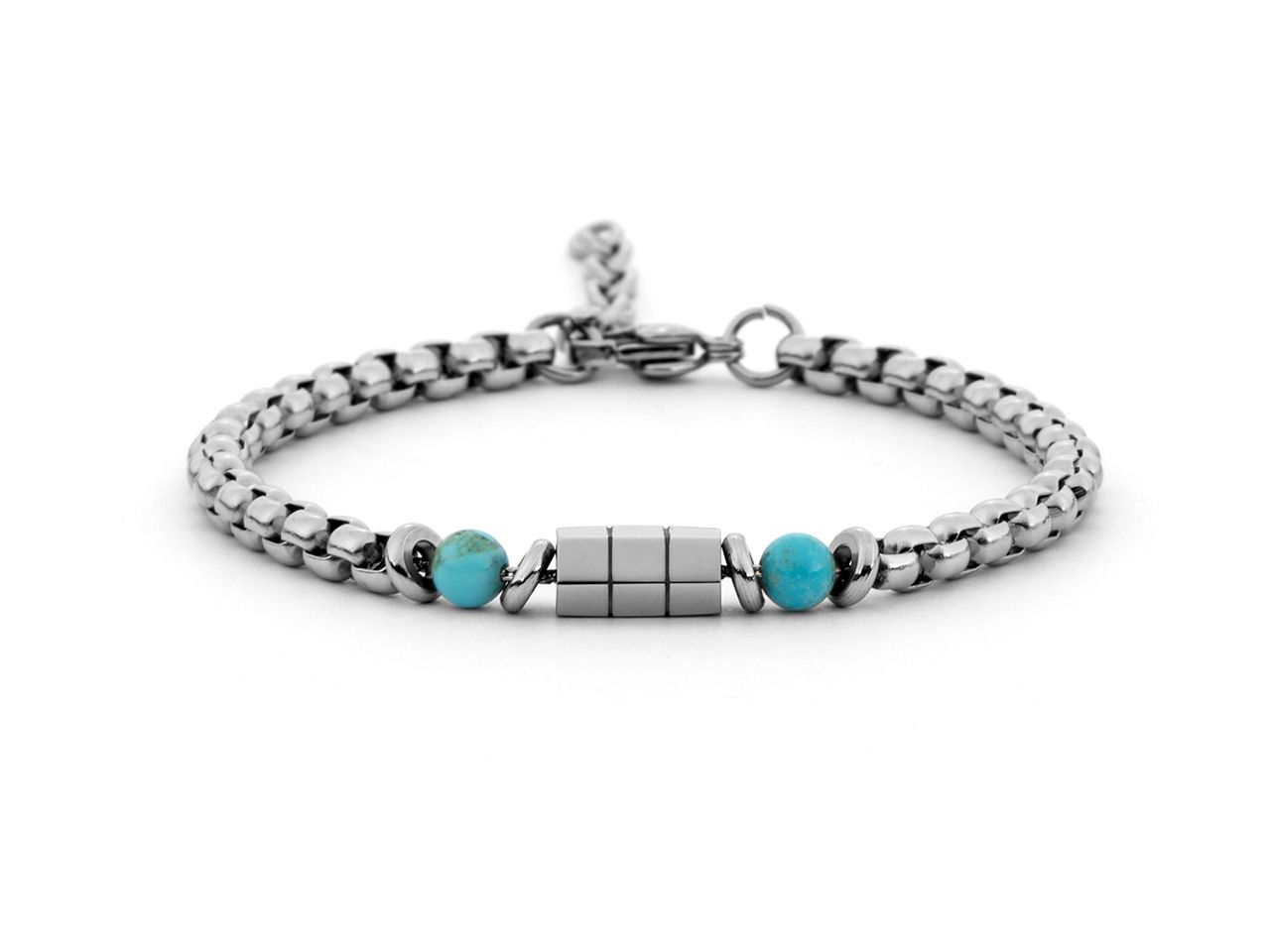 Bracciale da uomo 4US Cesare Paciotti realizzato in acciaio inossidabile con pietre turchesi naturali, perfetto per aggiungere un tocco di colore e originalità al look. Design moderno e casual, ideale da indossare ogni giorno o per un regalo di stile. Lunghezza regolabile da 19 a 21 cm, chiusura con moschettone logato.