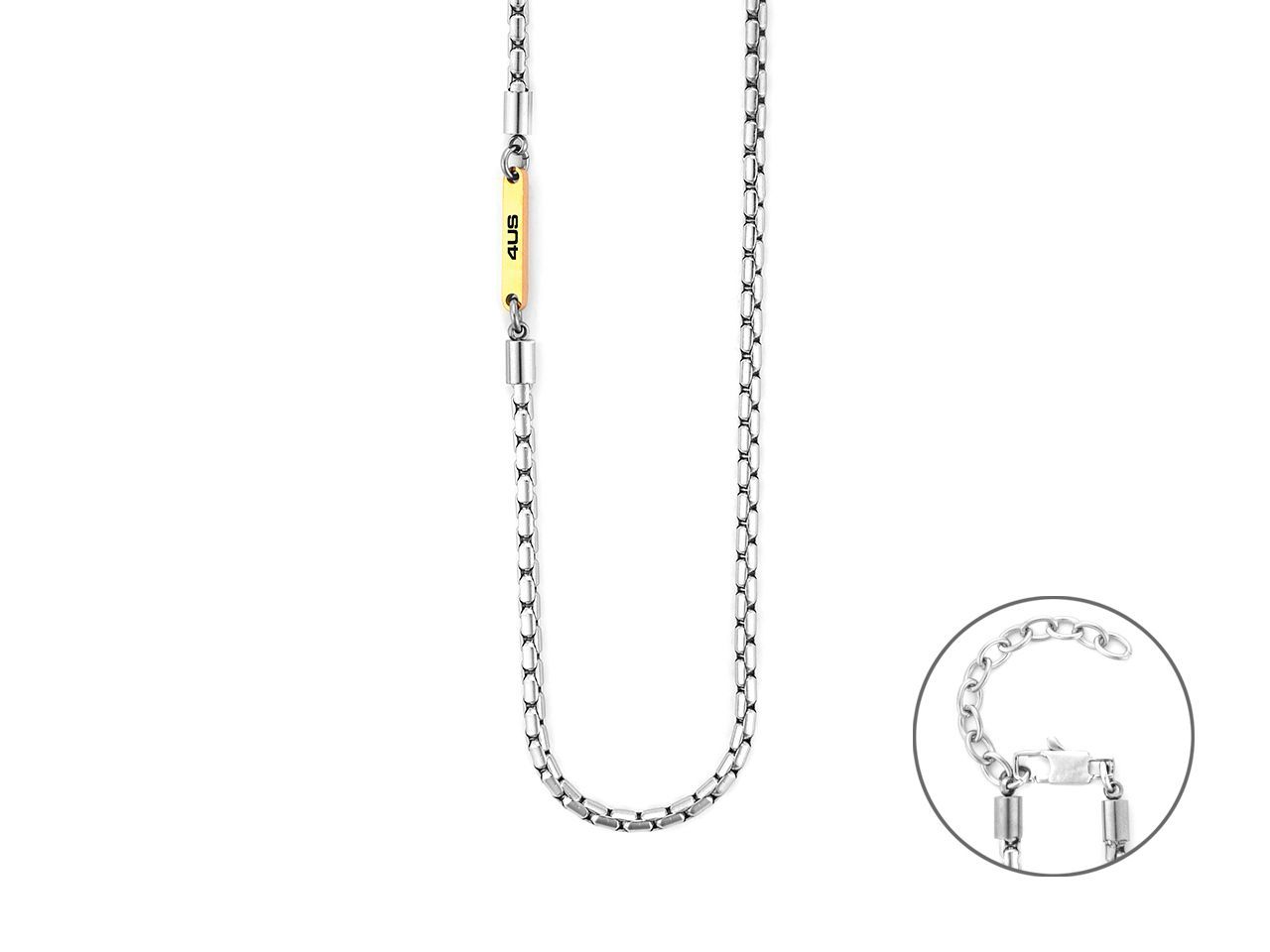 Collana da uomo 4US Cesare Paciotti in acciaio inossidabile con dettagli in PVD oro rosa, dallo stile moderno e raffinato. Ideale per chi cerca un accessorio elegante e versatile, perfetto da abbinare a qualsiasi look. Lunghezza 50 cm, chiusura con moschettone logato.