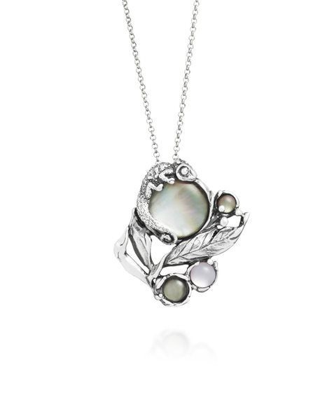Tutta la forza animalier di Giovanni Raspini in questo pendente in argento, fuso a cera persa e brunito, dove un camaleonte avvolge con grazia il castone principale, contornato da altri elementi naturali. Quattro gemme in taglio cabochon impreziosiscono questo gioiello: una grande madreperla grigia doppiata con quarzo, affiancata da altre due gemme dello stesso tipo, ma più piccole, ed una madreperla rosa sempre doppiata con quarzo. Completa il gioiello una catena micro rolò diamantata da 80 cm. Interamente fatto a mano in azienda.