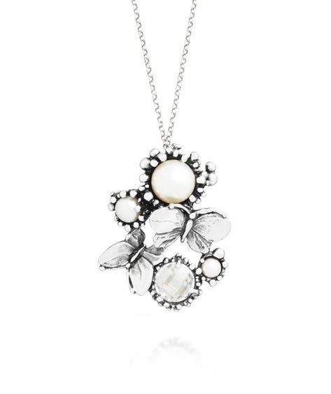 In questo elegante pendente in argento fuso e quindi brunito, un decoro primaverile, caratterizzato da due farfalle finemente modellate a mano con altri elementi naturalistici, fa da elegante castone a quattro gemme: tre perle naturali d'acqua dolce di diverse dimensioni ed un bellissimo e delicato zircone tondo sfaccettato. Completa il pendente una catena micro rolò diamantata da 80 cm. Interamente fatto a mano in azienda.