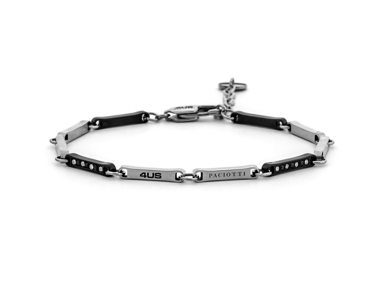 Bracciale da uomo 4US Cesare Paciotti in acciaio inossidabile con finitura PVD nero e dettagli impreziositi da zirconi neri e bianchi. Un design elegante e deciso, ideale per chi ama distinguersi con stile. Lunghezza regolabile da 19 a 21 cm, chiusura con moschettone logato.